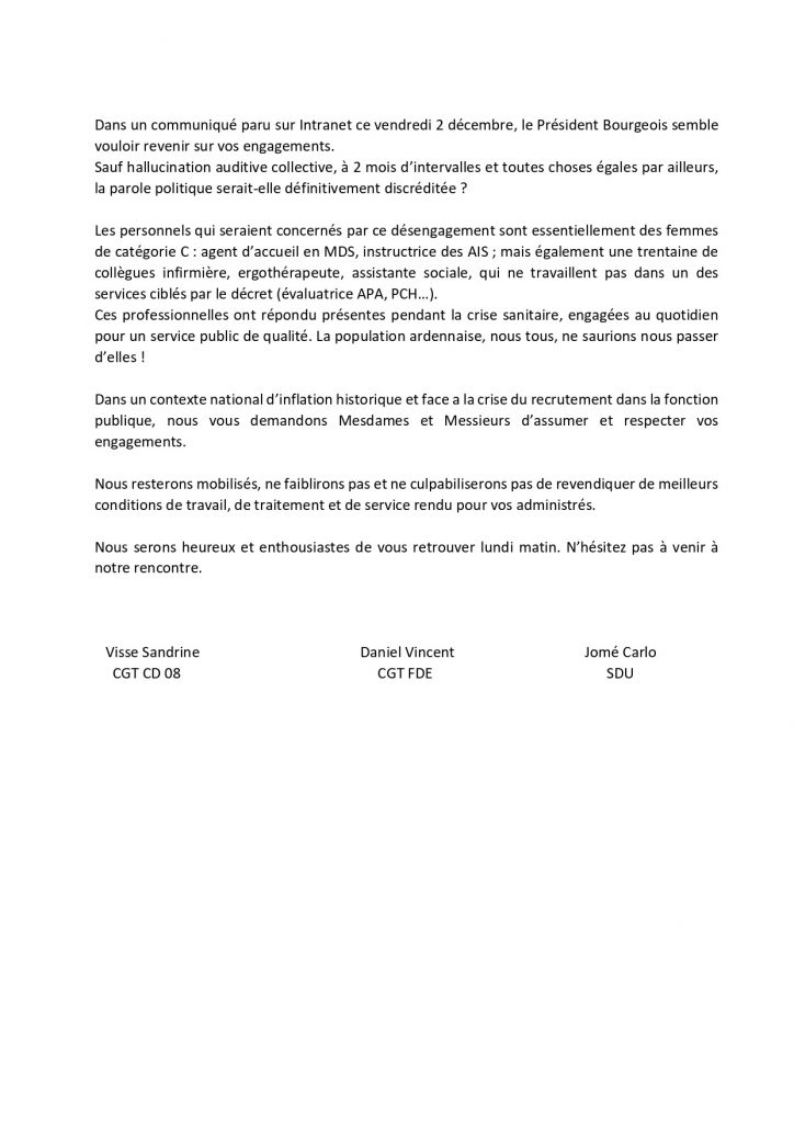 Nous resterons mobilisés, ne faiblirons pas et ne culpabiliserons pas de revendiquer de meilleurs conditions de travail, de traitement et de service rendu pour vos administrés.