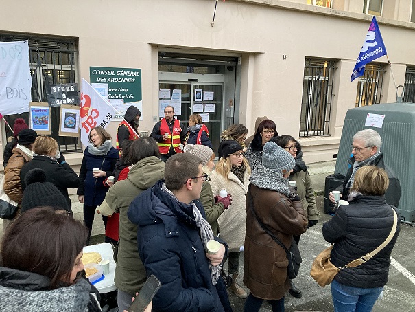 Une quarantaine d’agents avait répondu présent ce matin pour manifester leur colère devant la Direction des Solidarités. D’autres collègues ont fait grève 1 heure ou plus sur leur lieu de travail (l’accueil de la MDS de Sedan était fermé) pour montrer leur solidarité et faire passer le message: NOUS NE LACHERONS PAS !