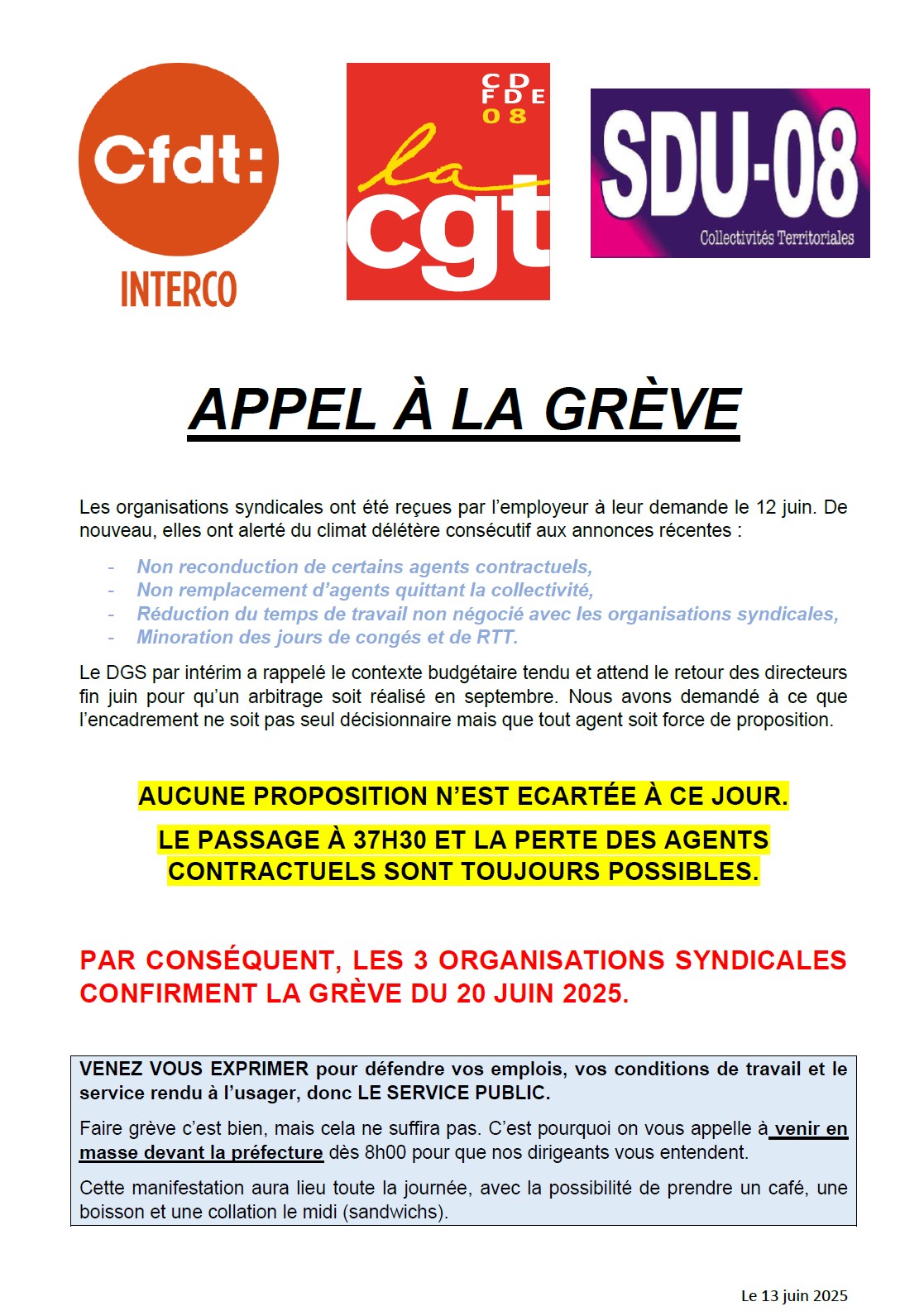 PAR CONSÉQUENT, LES 3 ORGANISATIONS SYNDICALES CONFIRMENT LA GRÈVE DU 20 JUIN 2025.