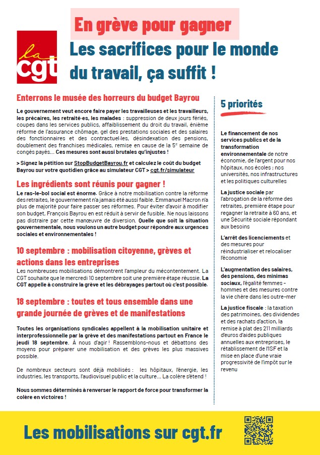 La CGT se félicite que les initiatives se multiplient d’ores et déjà et appelle à les amplifier. La dynamique de l’initiative citoyenne du 10 septembre démontre l’ampleur de la colère sociale.