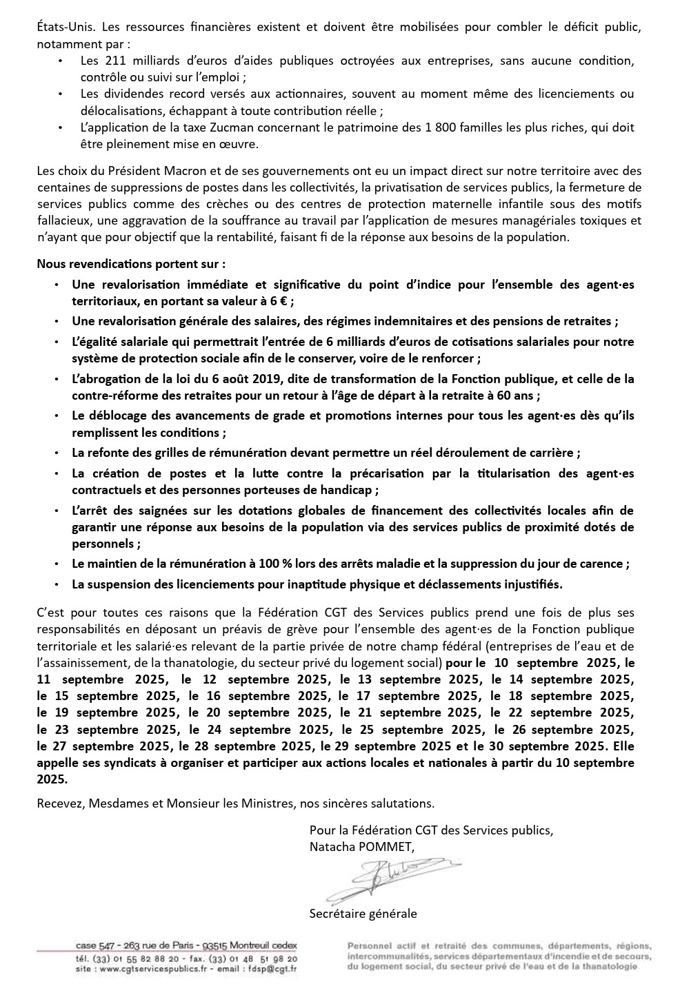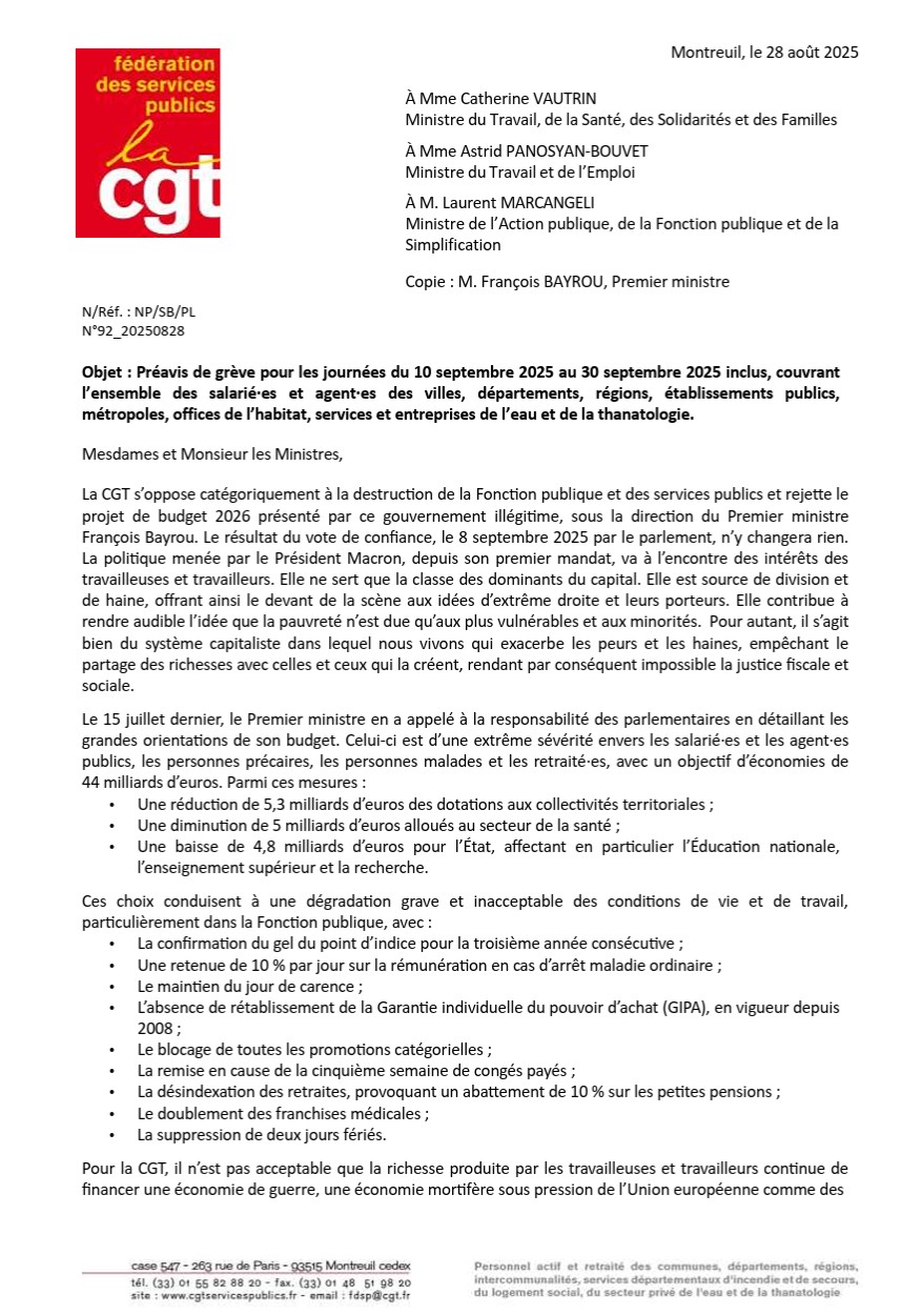 Préavis de grève pour les journées du 10 septembre 2025 au 30 septembre 2025 inclus, couvrant l’ensemble des salarié·es et agent·es des villes, départements, régions, établissements publics, métropoles, offices de l’habitat, services et entreprises de l’eau et de la thanatologie.