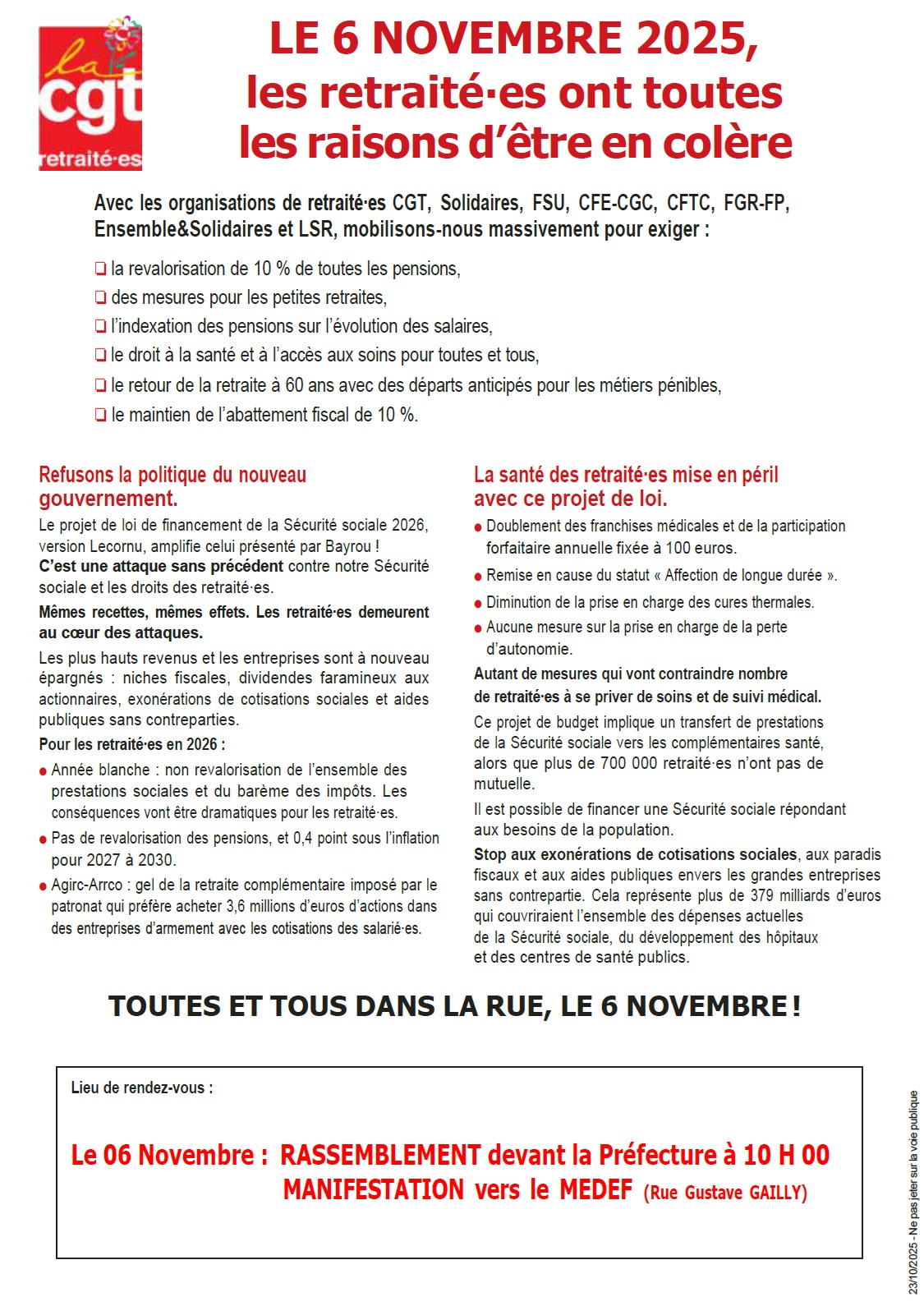 Aussi, l’Union Départementale CGT des Ardennes appelle à se mobiliser massivement aux côtés des organisations de retraité.e.s pour défendre notre Sécurité Sociale et le droit à une retraite digne :