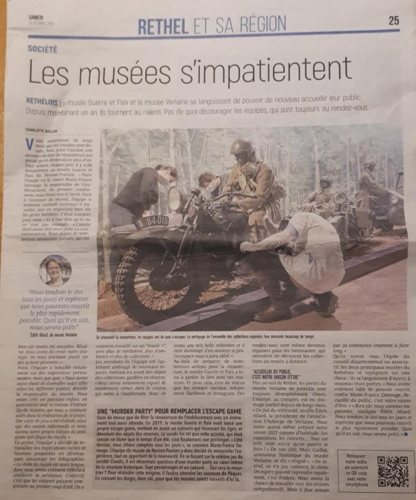 Dans l’article du journal l’Ardennais du 13 février, la « potentate » clame en souriant que toute l’équipe est là et prête pour l’ouverture du musée dès que le gouvernement donnera le feu vert.