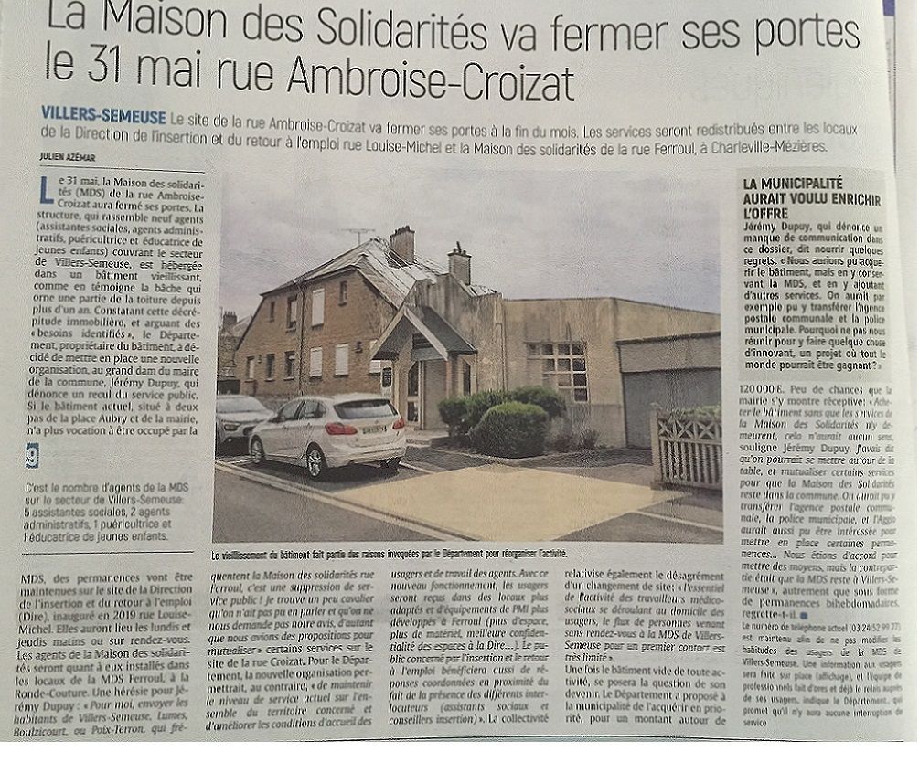 Bref ! Pas le moment pour les services sociaux de réduire la voilure….sauf au Conseil Départemental des Ardennes, qui va fermer la Maison des Solidarité de Villers-Semeuse.