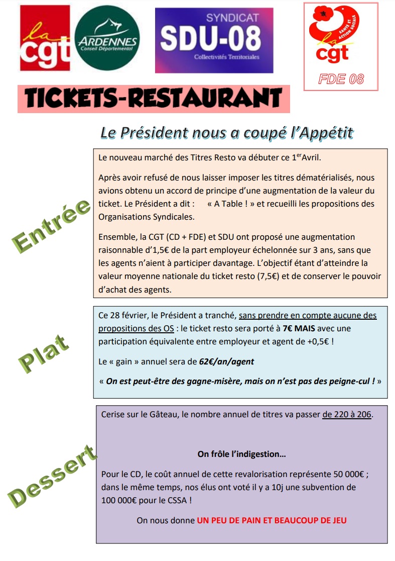 le Président a tranché, sans prendre en compte aucune des propositions des OS : le ticket resto sera porté à 7€ MAIS avec une participation équivalente entre employeur et agent de +0,5€ !